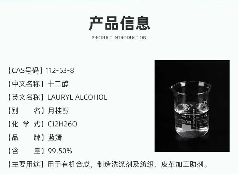 十二醇,又稱月桂醇、分子式為C12H26O。其為無色液體,是具有弱而持久的油脂氣味屬于醇類的一種,淡黃色、有刺激性氣味油狀液體或固體??扇?,低毒。不溶于水,可以溶于有機溶劑乙醇、乙醚。 與濃硫酸作用,會發(fā)生酯化反應,產(chǎn)物為十二烷基硫酸(硫酸十二烷酯),引入鈉可得常見表面活性劑十二烷基硫酸鈉(SDS)。常用于牙膏、肥皂等清潔用品的生產(chǎn)。 不過,使其與堿性物質(zhì)作用,多不會有反應。